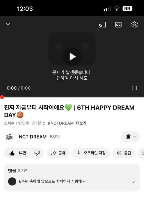 거의 5개월째 뜰때마다 들어가보는데 매번 저렇게 떠서 이유를 모르겠음, 저거 재생버튼 누르면 한 10초? 정도는 영상다시 틀어지는데 바로 또 오류 남