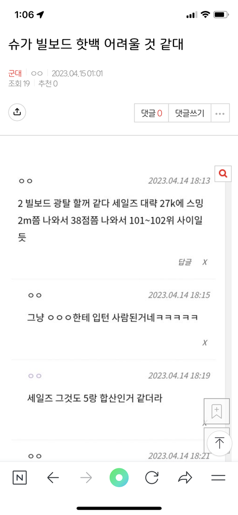 ‼️조방‼️슈가 빌보드 핫백 어려울 것 같대