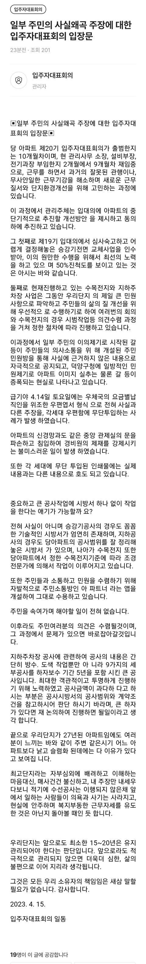 ▣일부 주민의 사실왜곡 주장에 대한 입주자대표회의 입장문▣