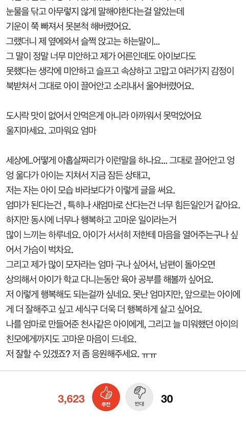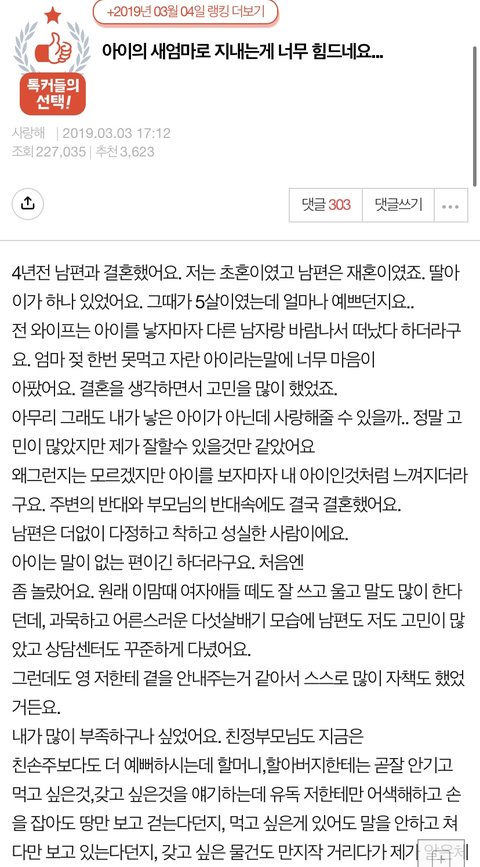 나도 지금 11살 9살 두아이랑 8살 2살 두아이 이렇게 키우는 재혼가정인데 9살 아이가 새엄마가 이래라 저래라 하는게 너무 싫어요 친엄마도 아니면서 자꾸 뭐라해서 기분나빠요 이런말을 하루에 한번씩 해서 지칠대로 지친상태임.. 다들 반대하고 거기가면 너 애키우러 가는거다 정신차려라 해도 나보다 신랑을 더 사랑해서 망설임없이 왔는데 요즘은 하루에도 몇번씩 찾아오는 현타에 약해지지않으려 정신 다잡는데 너무 힘들고 외롭고 지친다.. 내팔자 내가 꼰거라 어디에 털어놓을수도 없고 돌이킬수도 없이 내가 병신이라 이렇게 살고있지만 나도 언젠간 저런날이 오지않을까... 힘내서 애들 사랑해줘야지..