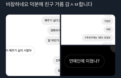 좋게 말했는데도 뇌절친거면 본인 잘못같은데? 저정도로 대놓고 욕 박은거면 원글쓰니는 사람 거른게 아니라 걸러진거임… 손절하자고 말만 안 했지 뭐 그러거나 말거나 상관없으니까 저 정도로 세게 말한거겠지. 말투 너무하긴 한데 저 사람 자유고 성격이지 뭐; 난 그것보단 저렇게 진심으로 짜증내는데 다시 투표 부탁하는게 더 이해 안되는데… 눈치 사망했나