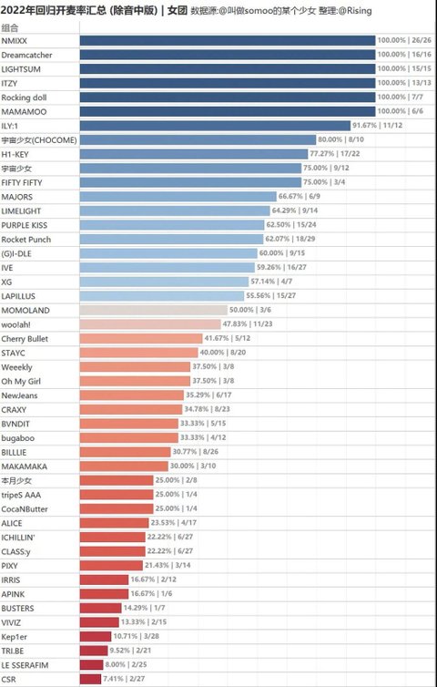 2022년 걸그룹 음방 라이브 시도 비율 순위