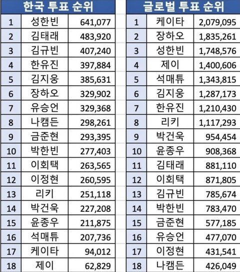 지금 한국표 영향 ㅈ도 없어서 성한빈 3위 김태래 11위 3차 글로벌 순위 그대로 나온다고 진짜 진짜 각성해야 됨