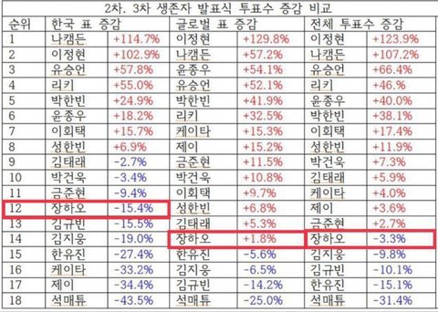 국내팬 유입 체감되게 늘었는데도 한국표는 6위 고정임 국적디버프가 너무 큼 장하오픽들은 장하오만 살려