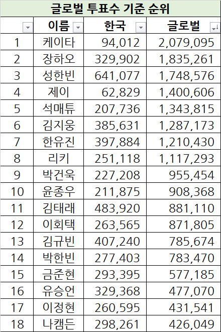 거기다 정병존에 국내픽이 더 높은 김규빈, 김태래, 박한빈, 박건욱같은 애들은 진짜 이 악물고 투표해야 함 글로벌픽이 올라오면 제일 먼저 밀리는 애들이 걔네임