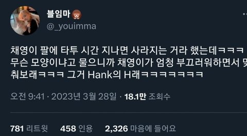 타투 아니고 헤나야 ㅋㅋㅋㅋ 채영이가 팬싸에서 얼마 안가서 지워질거라고 밝힘