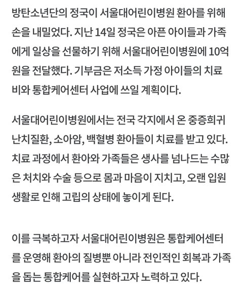 이게 진짜 너무 큰 일인게 요즘 소아과도 그렇고 어린이대병원도 그렇고 원래 이쪽이 적자가 날 수 밖에 없는 구조라서 요즘 정말 많이 힘듦ㅜㅜ 그래서 요즘 새벽에 아이들 아파도 병원 못가거나 가도 어른 병원 가야되는 경우가 엄청 많은데 정국이 기부 덕분에 아동 병원이 더 활성화될 듯ㅜㅜ 진짜 장하다 정구기