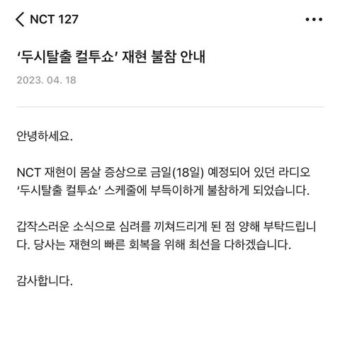 투어때 아파도 약먹고 무대 뛰었는데 진짜 많이 아픈가보다 얼른 회복하길