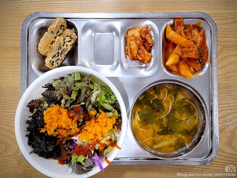 날치알생야채비빔밥, 근대콩나물국, 어묵매콤떡볶이, 야채김말이튀김, 포기김치