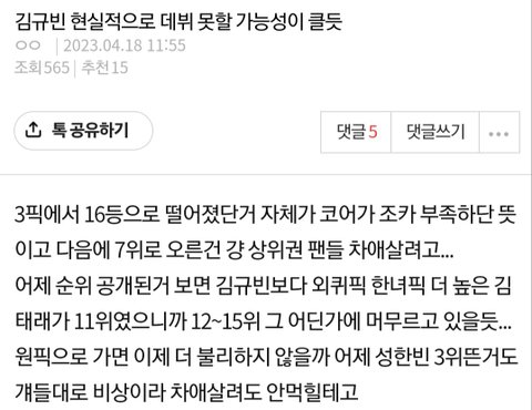 김규빈 현실적으로 떨어질 것 같다는 것도 ㅋㅋㅋ