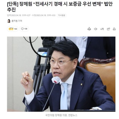 친윤계 핵심인 장제원 국민의힘 의원은 18일 이런 내용의 지방세기본법 개정안을 발의했다. 박대출·이철규·박성민·배현진 등 당 지도부 포함 총 49명의 국민의힘 의원이 공동 발의 명단에 이름을 올린 개정안은 주택이 경매 등으로 매각되는 경우, 임차인이 임차보증금을 재산세 등 해당 주택에 부과된 지방세보다 우선하여 변제받도록 했다.