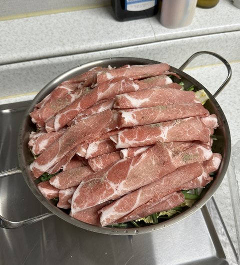 냄비 바닥에 배추와 부추 등 야채를 깔고 위에 고기를 쌓은 후,