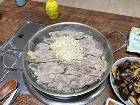 돼지고기(앞다리 또는 삼겹. 앞다리를 좋아함) 한 근을