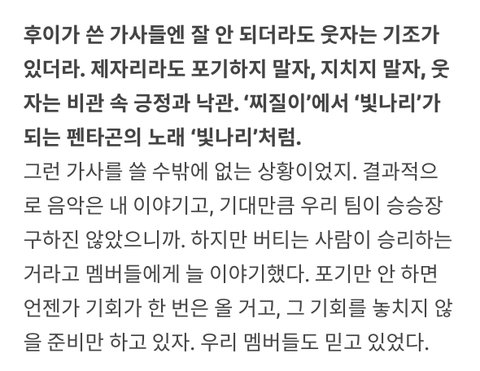 이런 둘이 맏형과 리더로 있어줬기 때문에 키노가 펜타곤을 계속 가게 하는 원동력이 인복인 것 같다고 말하고 큰 한방이 필요하다는 말에 바로 올 거라고 확신에 차서 말할 수 있었던 게 아닐까