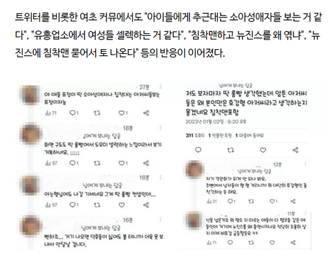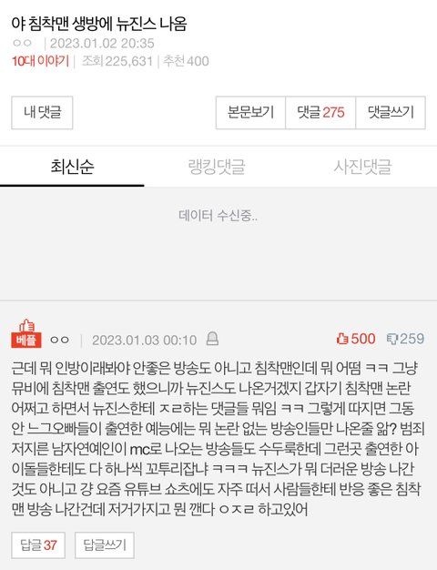 뉴진스도 첫베플부터 추천수 500개씩이나 눌리면서 쉴드 받았자나