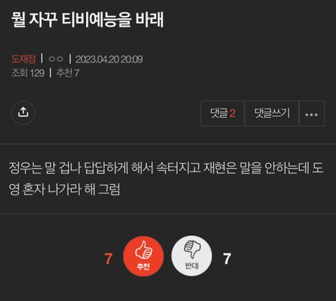 재현 정우 후려치는거에 추천수뭐임? 그래서 도영이 집사부해서 화제성순위를 들었어 광고를 따왔어? 혼자 놀토나왔을때는 반응이 있긴했음? 당장 구독자 700만명인 리무진나와도 인동도 못드는판에ㅋㅋ 도영만 올려치는거에 추천수 ㅈㄴ 쳐박는거보면 타멤들 까글도 얘네네
