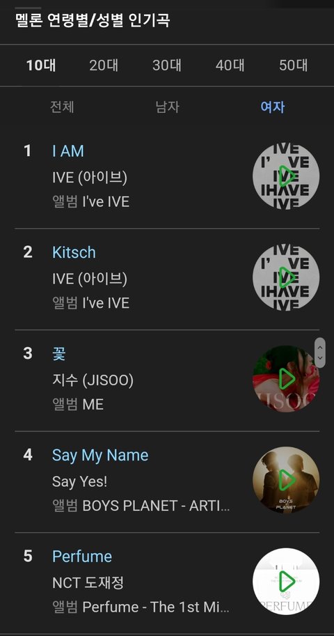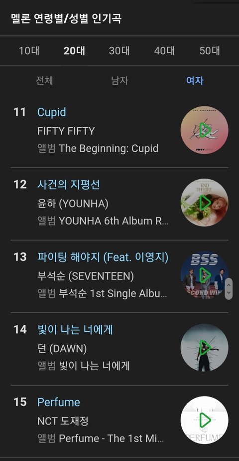 10대 여성 5위 퍼퓸 15후유증 16키스 22다이브 23스트로베리 선데이