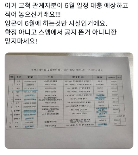 아마 이 주는 확정인 거 같은데 이런 얘기가 있어서... 그담주 화요일에 야구 있어서 일요일은 무리이겠지ㅠㅠ