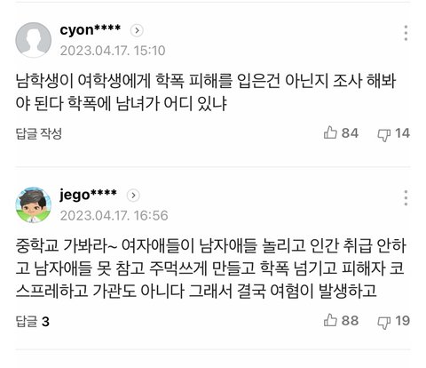 이유는 나오지도 않고 그냥 남중생이 여중생 찌르고 투신했다고만 나와있었을 때는 기사 댓글에서 여자애가 학폭했을 거라고 망상하면서 한남들은 요즘 중고딩 한녀들이 어쩌고 조카 욕하고 아들맘들은 아들 키우는데 맘이 넘 아파요ㅠㅠ 이 ㅈㄹ을 하거든? 근데 막상 왜안만나줘 범죄였던 거 밝혀지니까 기사 딱 한 개 나옴ㅋㅋㅋㅋㅋ 오마이뉴스 기사 하나 빼곤 후속기사 하나도 안 나오더라