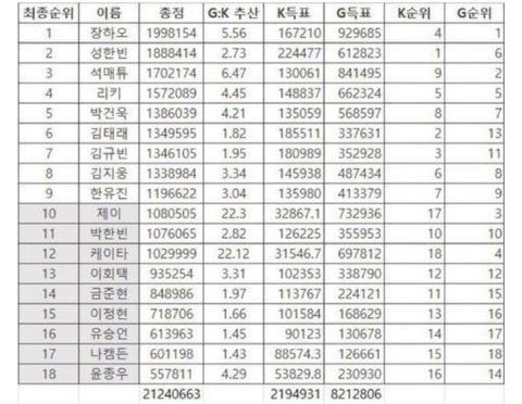 보이즈플래닛 최종결과를 나타낸 위 표는 수학적인 계산으로 만들어낸 추정값입니다.