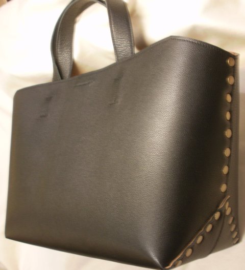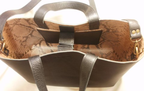 블랙 컬러 내추럴 가죽과 베이지 투톤 컬러 스네이크 무늬 양가죽 및 엔틱 도금 금속 장식과 리벳 등으로 장식하여 제작한 핸드메이드 빅사이즈 천연 가죽 토트 백입니다.(마디샤 가죽공예)