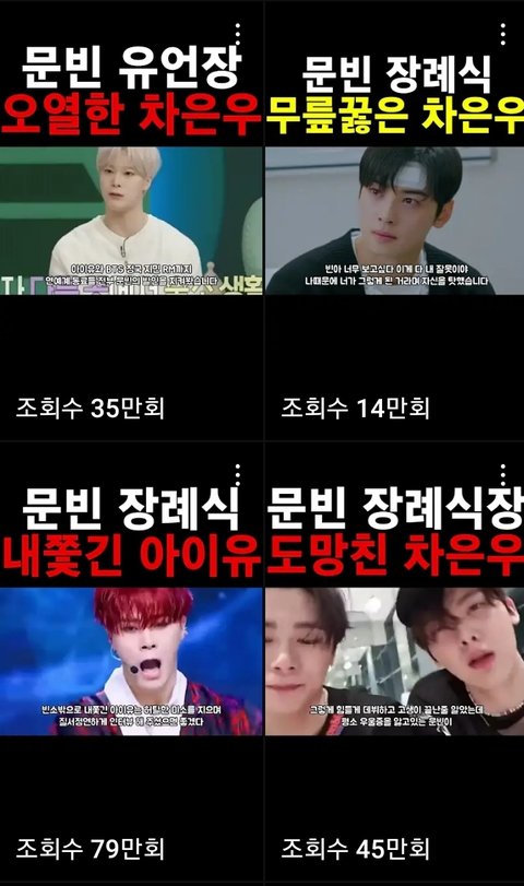 아니 문빈 사망한거로 죄다 유튜브에 아이유 차은우 등등 언급하면서 일반인이 알 수 없을만한 사실을 공개하는데 이게 뭐임? 이사람 기자인가? 댓글은 다 욕하는게 아니라 오히려 좋게 반응보이는데 이게 도대체 뭐임 아이유 쫓겨났다 차은우 무릎꿇었다 등등 내용이 올라오는데 도대체 어떻게 알고 무슨 근거로 이런 영상 올리는건지,, 이게 맞아?