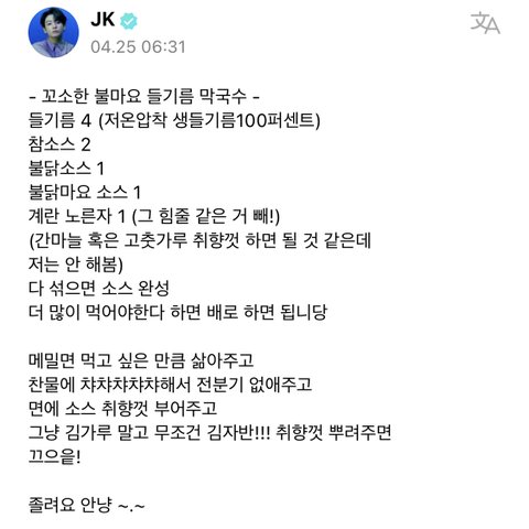 먹는거에 진심이신 먹짱 전정국 선생님 레시피대로 해먹어 봤는데 진심 존맛탱임ㅠㅠ 먹는거에 진심인 먹짱와기 아니랄까 들기름 막국수 레시피 얘기하면서 맛있었다고 몇십분동안 얘기한 거 겁나 귀여움ㅋㅋㅋㅋㅋㅋ큐ㅠㅠ
