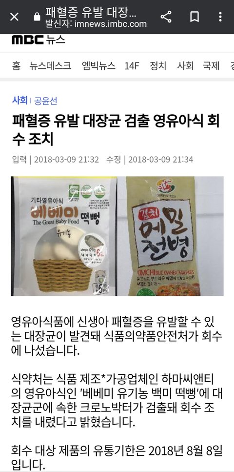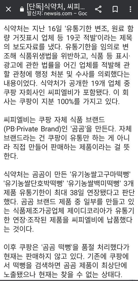 HCCP 인증까지 받고 아기들 먹는 유기농 떡뻥에 무려 대장균인 크로노박터균을 넣어 수년여간 전국적으로 어마어마한 양을 제조 및 유통하다 걸렸죠. 그런데 이 업체는 이런 짓 하다가 걸리자, 회사 이름만 제이디코리아로 바꾸고 같은 제품을 쿠팡에 납품을 합니다. 그리고 유통기간까지 조작하면요. 그 제품은 곰곰떡뻥 등의 이름으로 또 수년간 엄청나게 전국적으로 팔려나갔죠. 그리고 또 걸립니다. 그러자 이젠......