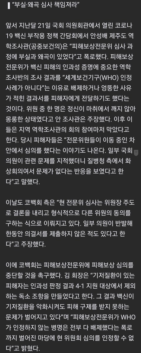 인과성 불충분등 연관도 없는 기저질환을 이유로 대다수의 피해자들이 보상을 받지 못해 정부를 상대로 법정소송까지 벌였고 법정소송도 상황이 여의치 않은 피해자들은 하지도 못하는 상황입니다