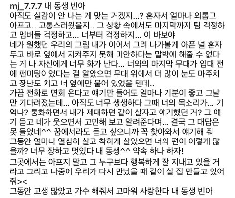 아 진짜 멤버들 슬픔은 가늠이 안 간다... 활동에 팬미팅까지 같이했던 사람이 없어지는 슬픔이 어떨지 ㅠㅠ