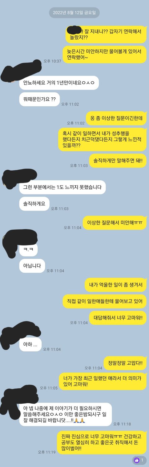 저는 목격자도 있고 다른 피해자도 있다는 말에 황당하여 가게에서 근무했던 모든 “여성”직원, 알바 에게 직접 연락하여 내가 그런일이 있는지 보고 들은게 있는지 불쾌한 접촉이 있었는지 물었습니다. 그리고 “그러실분 아니잖아요 필요한 일 있으면 도와드리겠다” 라는등 아니라는 대답만 들었구요.