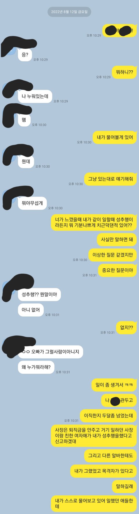 평소에는 반말을 하던애가 갑자기 존댓말을 하며 말투를 바꾸어 전에 본인을 만지고 성추행 하지 않았느냐 하는 말을 하며, 목격자도 있고 다른 피해자도 있다면서 소름끼친다고 연락 하지 말라느니 하는 말을 하더군요..