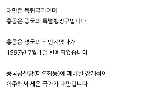장하오 출신 지역 자체가 항미원조 관련 노래를 부르면 민심 박살당하는 나라라고 ㅋㅋㅋㅋ 대만 자체가 중국에서 독립해나온 지역인데 중국때문에 분단된 국가에 대항하는 노래를 부르겠어? 왜이렇게 멍청해? 푸젠성 자체가 대만으로 같이 못딸려가서 어쩔 수 없이 중국 국적은 달고 차별당하는 나라라니까 말귀를 못알아듣는건가;