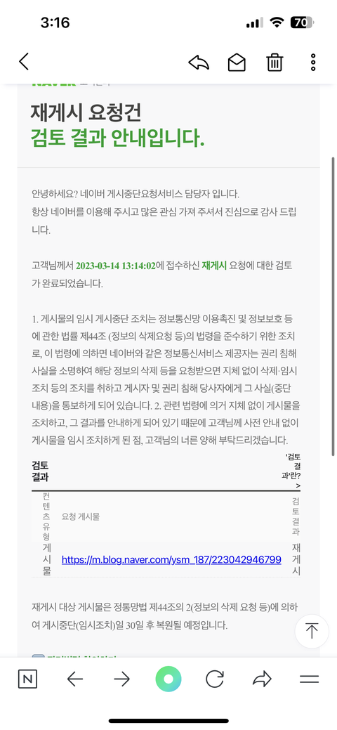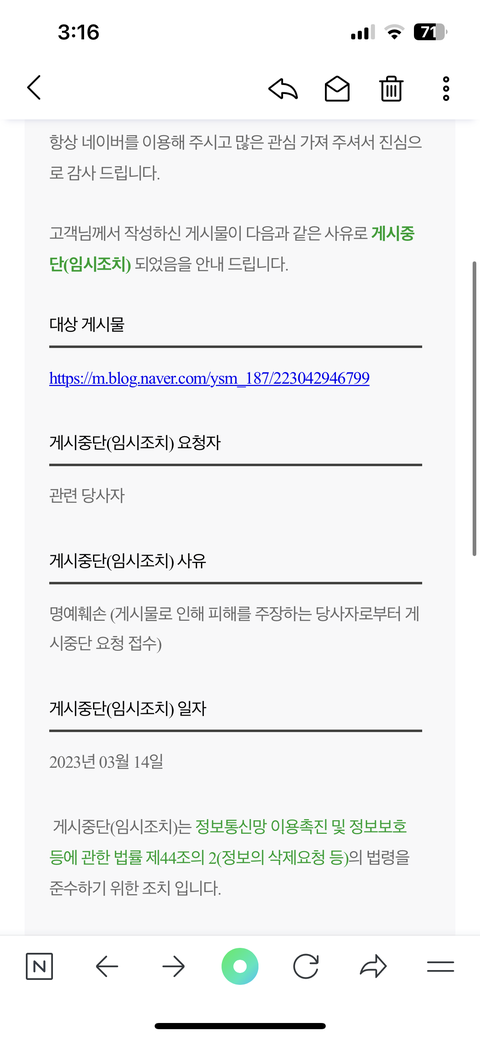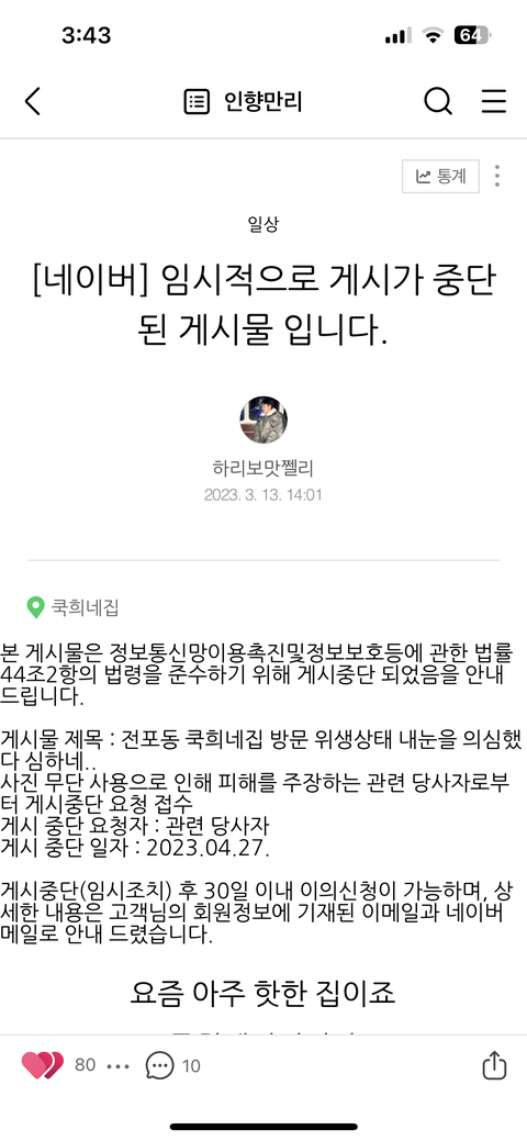 3월에도 신고당해서 네이버에 문의해서 한달만에 풀리고