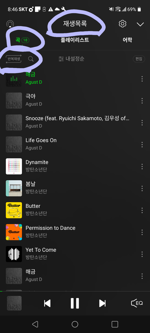 플레이리스트를 만드는게 아니라 재생목록에 권장스밍곡 18곡을 담아서 스밍하기