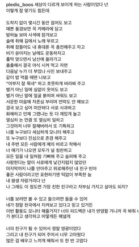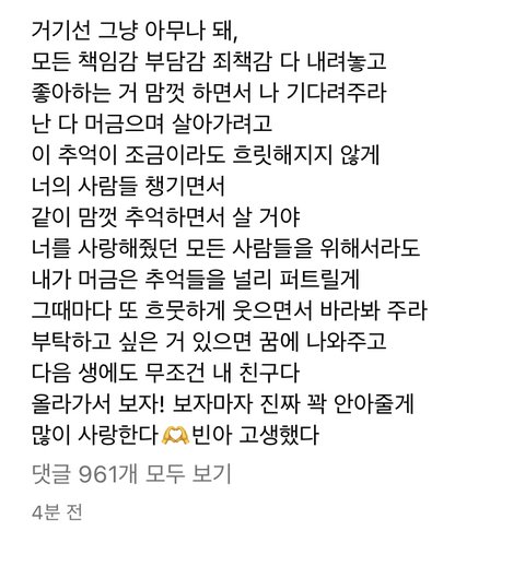 감히 저 마음을 헤아릴수도 없이 그냥 너무 아프다 부디 친구와의 이별을 잘 이겨내고 승관님 인생에 이보다 슬픈일은 더이상 없이 그냥 행복했음 좋겠다..그러다 가끔 추억 들려주고 기억해주길..