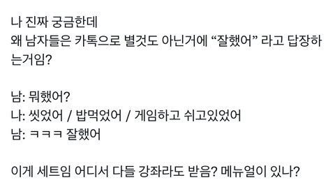 뭐 어쩌라고임.. 잘했다하면 뭐라해야됨 고마워 이래야됨? 의미없는 대화 나누는거 진짜 싫어서 연애 못하겠음