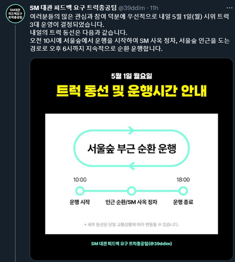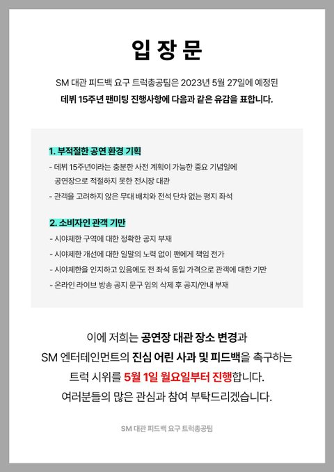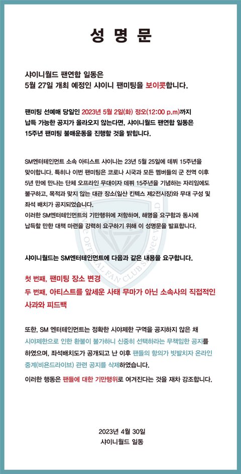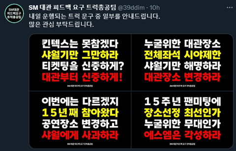 스엠은 타 팬덤 관련 논란으로 공연 장소를 변경했던 적도, 새벽 1시 14분에 실시간으로 사과문을 올린 적도 있음일부러 연휴 시작 전에 공지를 올리고 귀막아봤자 소용없다는 소리10년 넘게 별의별 짓 당해오고도 아티스트들 마음아플까봐 그냥 참았던 샤이니월드임적절한 해명과 조치가 없으면 이번에 뭐 하나 큰 일 터질거임