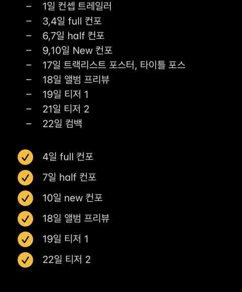 개인적으로 체크리스트에 있는 떡밥 모두 올리는데 컨포랑 앨범 프리뷰는 간단하게 멘트+사진+짤+링크 영업글 올리고 티저 1 혹은 티저 2 이후엔 종합된 컴백 영업글 올리는 게 좋을거 같다고 생각함 엔진들 의견도 듣고 싶어