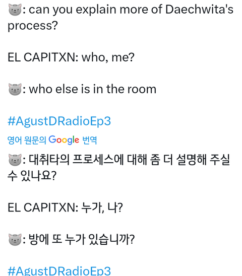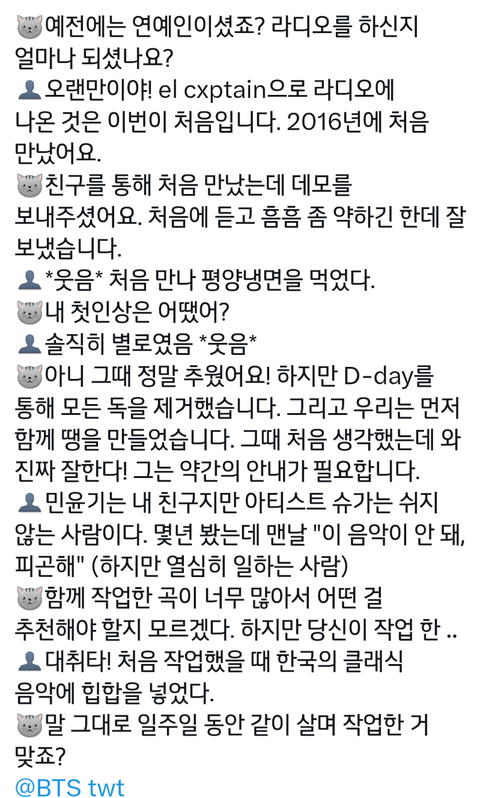 라디오시작했나봐 오늘은 친구분 나오셨나봐ㅋㅋ 라디오 못듣고 번역뜨는거 올라오는대로 보는중인데 윤기 신났나봄ㅋㅋ