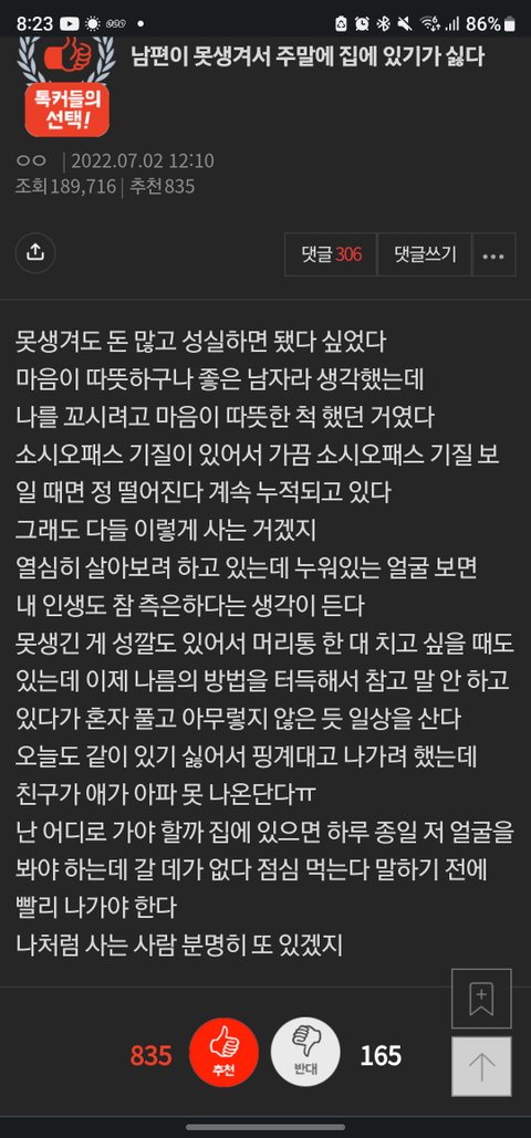 못생긴 게 성깔도 있어서 머리통 한 대 치고 싶을 때도 있는데 이제 나름의 방법을 터득해서 참고 말 안 하고 있다가 혼자 풀고 아무렇지 않은 듯 일상을 산다