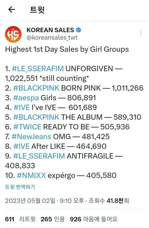 와 르세라핌 첫날 앨범판매량 걸그룹 1위 ㄷㄷㄷ