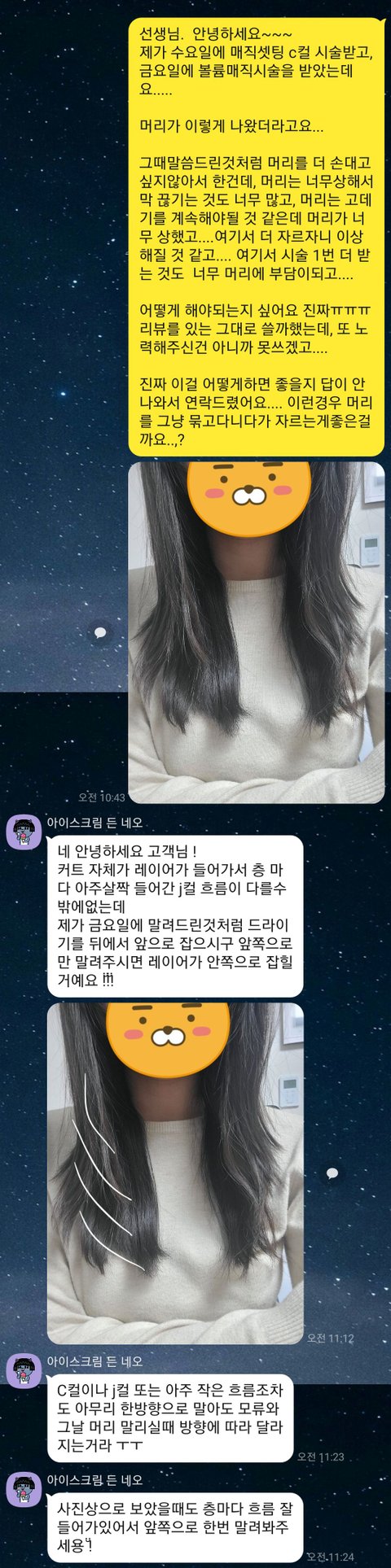 - 카톡으로 해당시술에 대해 이야기를 하였습니다. 답변은 J컬이라고 하며 머리를 앞쪽으로 말려달라고 하였습니다.
