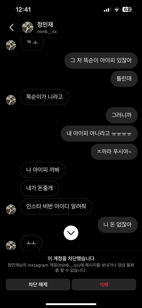 업로드를 하고있었습니다 (사칭한 사람 유튜브 닉네임: 민재1017) 저는 너무 화가나 다시 인스타로 찾아갔습니다. 하지만 역시 차단이...