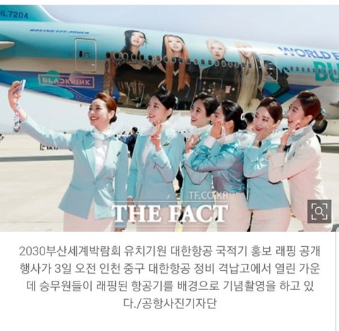 대한항공은 이번 부산세계박람회 유치 지원을 위해 보잉777-300ER 항공기를 동원하는 한편, 전 세계적 인지도를 갖춘 대한민국의 대표 아티스트인 블랙핑크를 항공기에 입혔다. 부산세계박람회 유치 기원 래핑항공기는 5월 4일 인천발 파리행 KE901편을 시작으로, 대한항공의 글로벌 네트워크를 토대로 전 세계 하늘을 누비며 부산세계박람회 유치 홍보 역할을 수행할 계획이다.