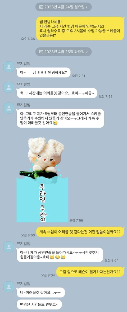 하지만 레슨 도중, 선생님 측으로부터 본인 공연 스케쥴로 인해 차주 이후 수업 진행이 불가능하다는 통보를 받았습니다.