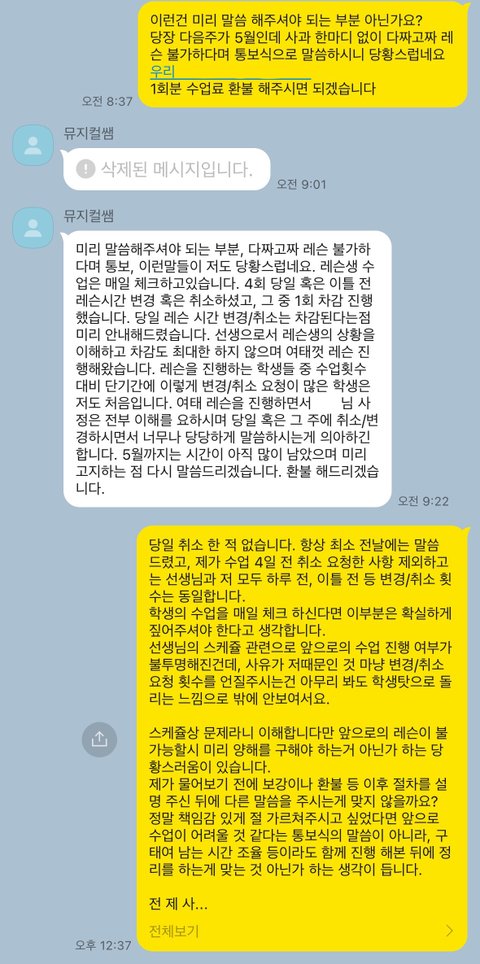 스케쥴 상 이유로 레슨 불가 통보 -> 환불 요청 -> 학생 탓 후 차단 -> 리뷰 작성 -> 대리인의 삭제 종용 및 법적 조치 협박 -> 불응 -> 리뷰 강제 삭제 -> 타 학생은 레슨 가능하다며 동일