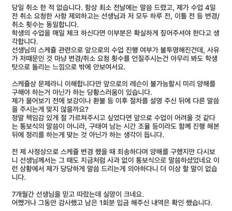 또한 전날 레슨 일정 변경과 앞으로의 레슨 지속 불가의 뉘앙스는 매우 다르다고 생각합니다.