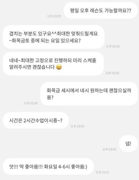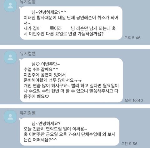 그날 레슨이 저 밖에 없으니 수업 일을 옮기자는 내용과 스케쥴이 많으니 이번주 레슨은 쉬어 간다는 내용, 레슨 당일에 오늘 개인 수업 말고 내일 단체 수업으로 오라는 제안 등 책임감을 가지고 임해야 하는 레슨치곤 캔슬 사유가 꽤나 황당했지만 사람과 사람 간의 일인지라 소통을 통해 조율할 수 있는 부분으로 판단하여 모두 이해하였습니다.