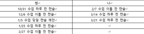 선생님과 저의 캔슬 타임라인도 함께 첨부합니다. 공지대로 월요일에 미리 일정을 조율한 건과, 패널티를 적용한 전날 취소 건을 제외해보니 오히려 선생님의 캔슬 건수가 더 많습니다. 카톡으로는 동일하다고 말씀 드렸었지만, 다시 계산해보니 선생님의 캔슬 횟수가 더 많았습니다.